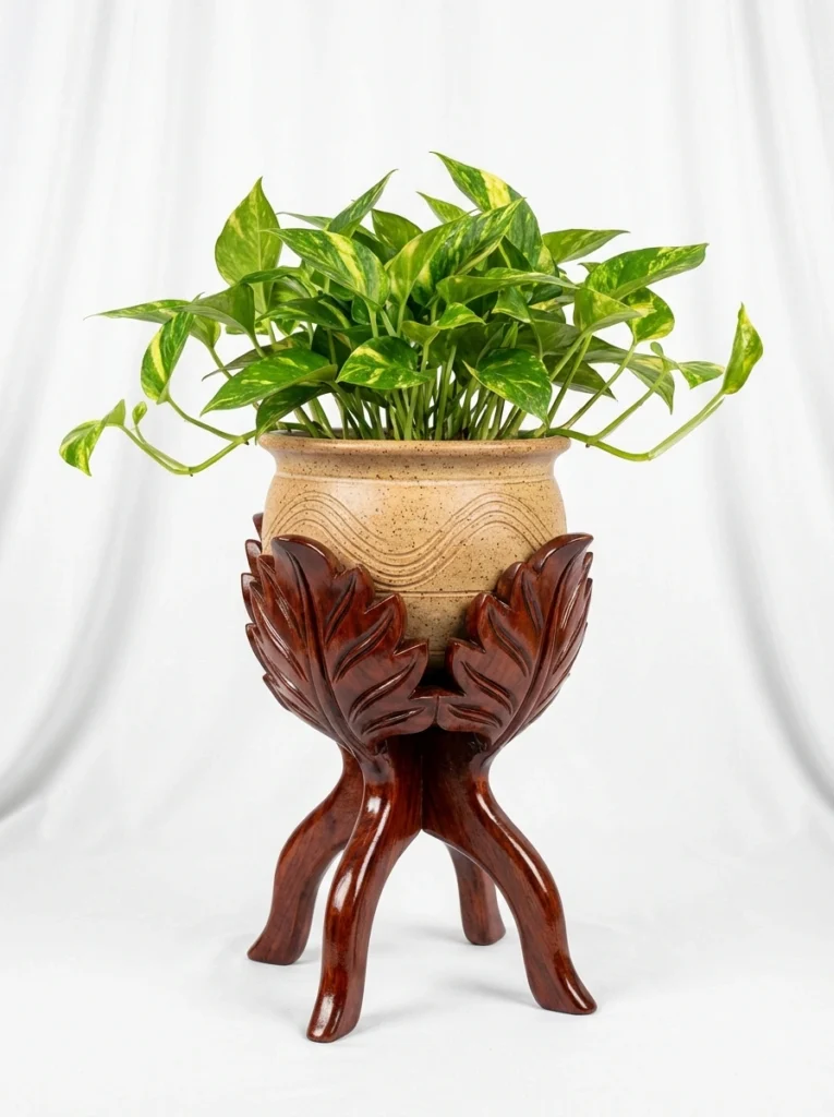 sometimes a plant stand is a piece of art on its own. This ornately carved dark wood base acts as a striking centerpiece for a simple, trailing pothos. When you have a heavy, detailed stand like this, keep the surrounding area uncluttered. A single, beautiful display piece makes a much stronger impact than a crowded tabletop.