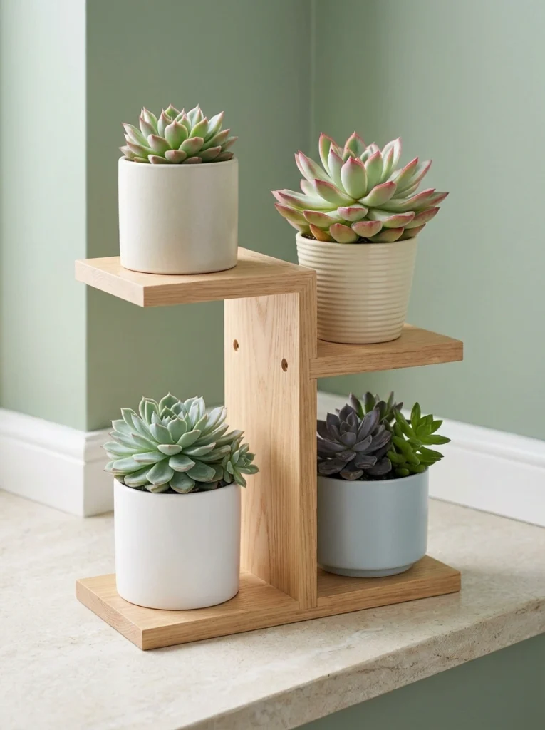 this compact, geometric wooden stand is ideal for tight spaces or countertops. It proves that even small decor pieces can make a strong impact. Arranging a few choice succulents in soft, neutral pots creates an authentic and cohesive micro-garden. Keeping the surrounding surface clean allows this charming little setup to truly shine, bringing life to your workspace.