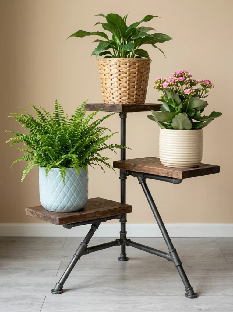 mixing dark stained wood with rugged metal pipes brings a fantastic industrial vibe to your display. This tiered structure feels incredibly intentional and sturdy. Contrast the harsh lines of the metal with soft, vibrant foliage and bright ceramic pots to make a strong visual impact. It creates a dynamic centerpiece that adds instant character to any blank corner.
