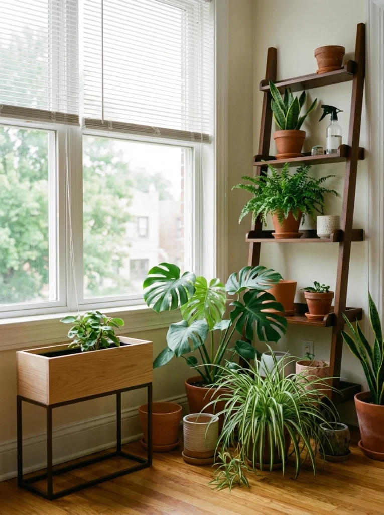 mixing a low modern planter with a tall, leaning wooden ladder creates a wonderfully cozy corner. A ladder shelf makes a strong impact without taking up much floor space. Choose classic terracotta and simple ceramics to feel authentic and cohesive with a relaxed vibe. Grouping your plants by the window ensures they get enough light while turning your favorite greenery into intentional decor.