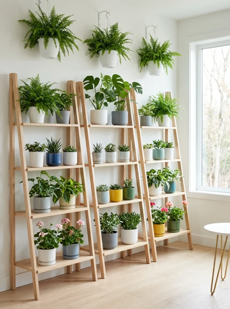 lining up matching wooden ladder shelves transforms a blank wall into a structured indoor jungle. Even with so many plants, it doesn’t feel cluttered because the repetitive shelving creates cohesive architecture. Mix and match colorful pots—like mustards, blues, and crisp whites—to make a strong, joyful impact. It’s a beautifully intentional way to display a massive collection while keeping floors clean.