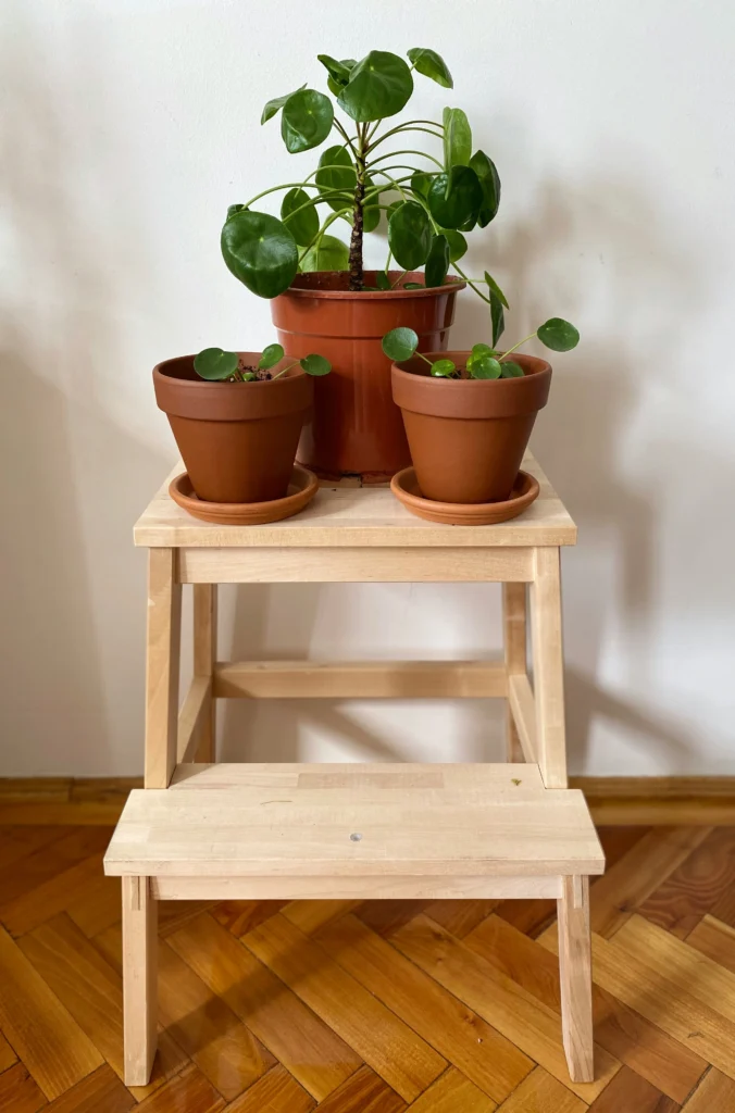You don’t always need a fancy plant stand; sometimes a simple wooden step stool is perfection! Displaying a family of little plants in classic terracotta pots feels so authentic and sweet. This understated look thrives on intentional simplicity. Sitting quietly beside a modern TV unit, the clean lines of the wood create a relaxed, clutter-free zone that feels incredibly inviting.