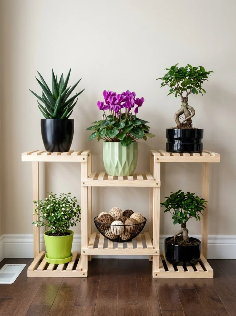 A symmetrical, multi-tiered slatted wood stand is fantastic for organizing a diverse collection. Intentional decor means balancing plants with other textural elements, like a bowl of woven rattan spheres. Choose pots in cohesive shades to tie the look together perfectly. The clean, open structure keeps the display feeling light and airy, effortlessly framing each individual plant.