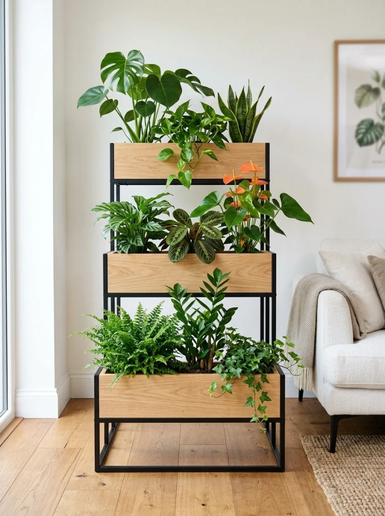 this tall, tiered wood and metal stand acts as a stunning living room focal point. Modern design thrives on intentional organization rather than a cluttered floor. The deep wooden boxes provide a cohesive home for trailing vines and lush greenery alike. Keep the surrounding space clean to let this piece truly stand out. It’s perfect for dividing a room while keeping things feeling fresh and open.