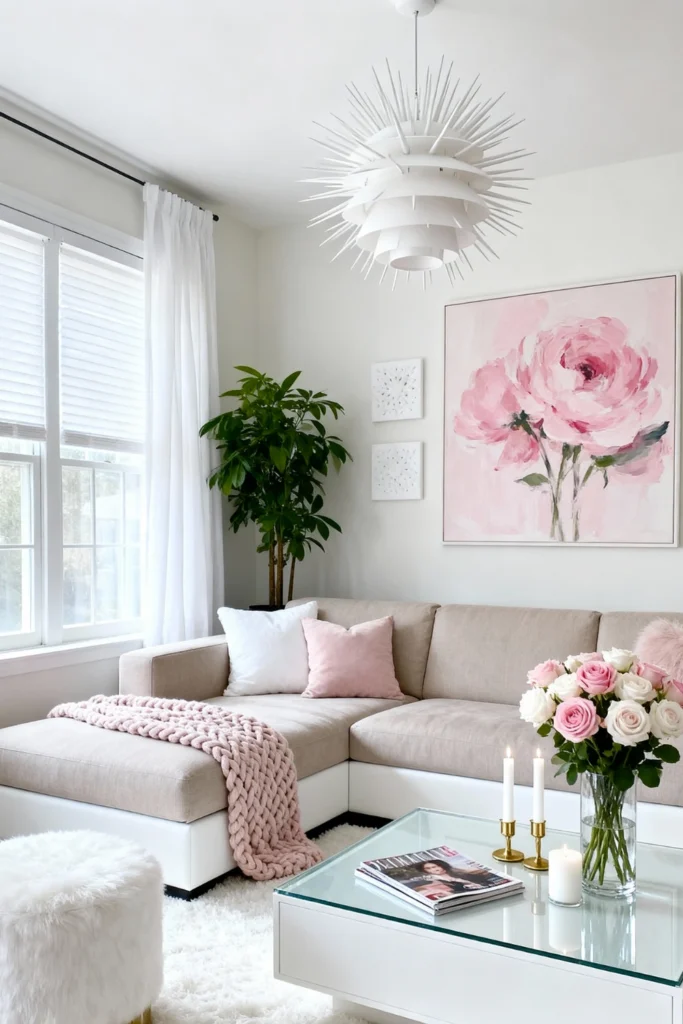 For the romantic at heart, soft pinks and whites are the way to go. Start with a light gray sectional and layer it with blush pink throws and pillows. A large-scale floral painting acts as the room’s heartbeat, pulling all those rosy tones together. Balance the sweetness with a modern, “spiky” white chandelier and a glass-top coffee table to keep things feeling light. A fluffy white flokati ottoman adds that final touch of “glam-chic” that makes the room feel like a boutique hotel.