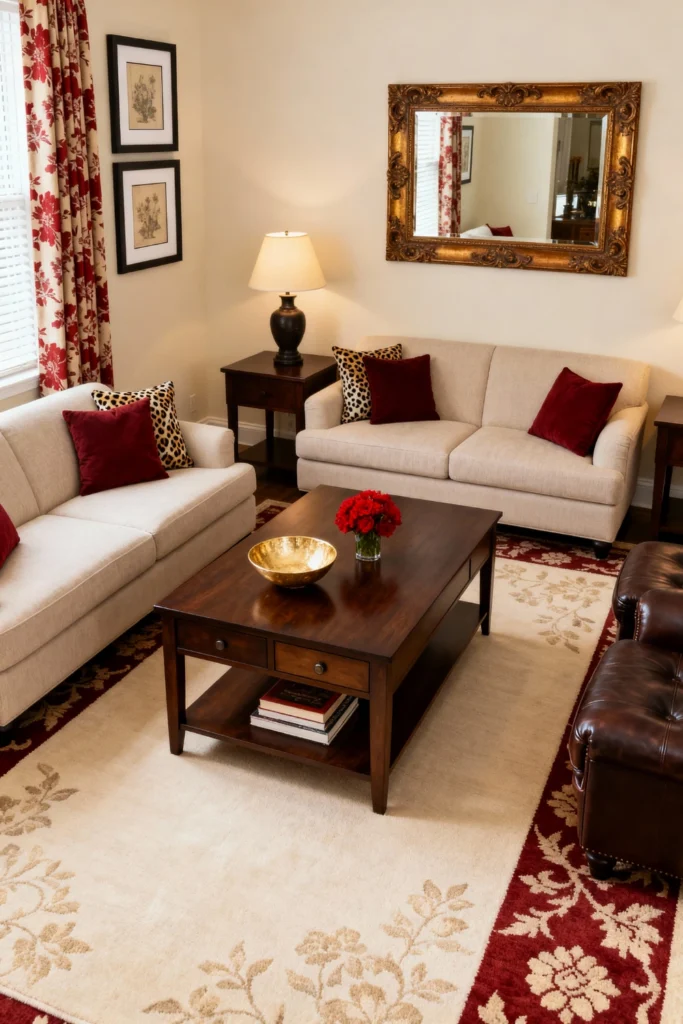 If you love a more formal, traditional vibe, this “New Traditional” style is calling. Pair cream-colored sofas with rich mahogany furniture for a high-contrast, polished look. Use deep red accents—like velvet pillows and floral borders on your rug—to bring in a sense of drama. A large, ornate gold mirror over the sofa reflects light and adds a touch of old-world glamour. It’s a balanced, symmetrical setup that feels intentional, stately, and incredibly welcoming for guests.
