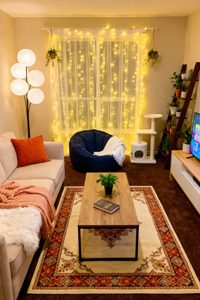 This is the ultimate “rainy day” sanctuary. Start with a warm, neutral base and layer in the magic with fairy lights draped behind sheer curtains—it creates an instant dreamscape. Add a deep blue bean bag for that “sink-in” comfort and a classic wooden ladder shelf to display your favorite plant babies. A rich, patterned rug over dark carpet adds a touch of traditional grounding to an otherwise whimsical space. It’s all about soft textures and low, amber lighting for maximum relaxation.