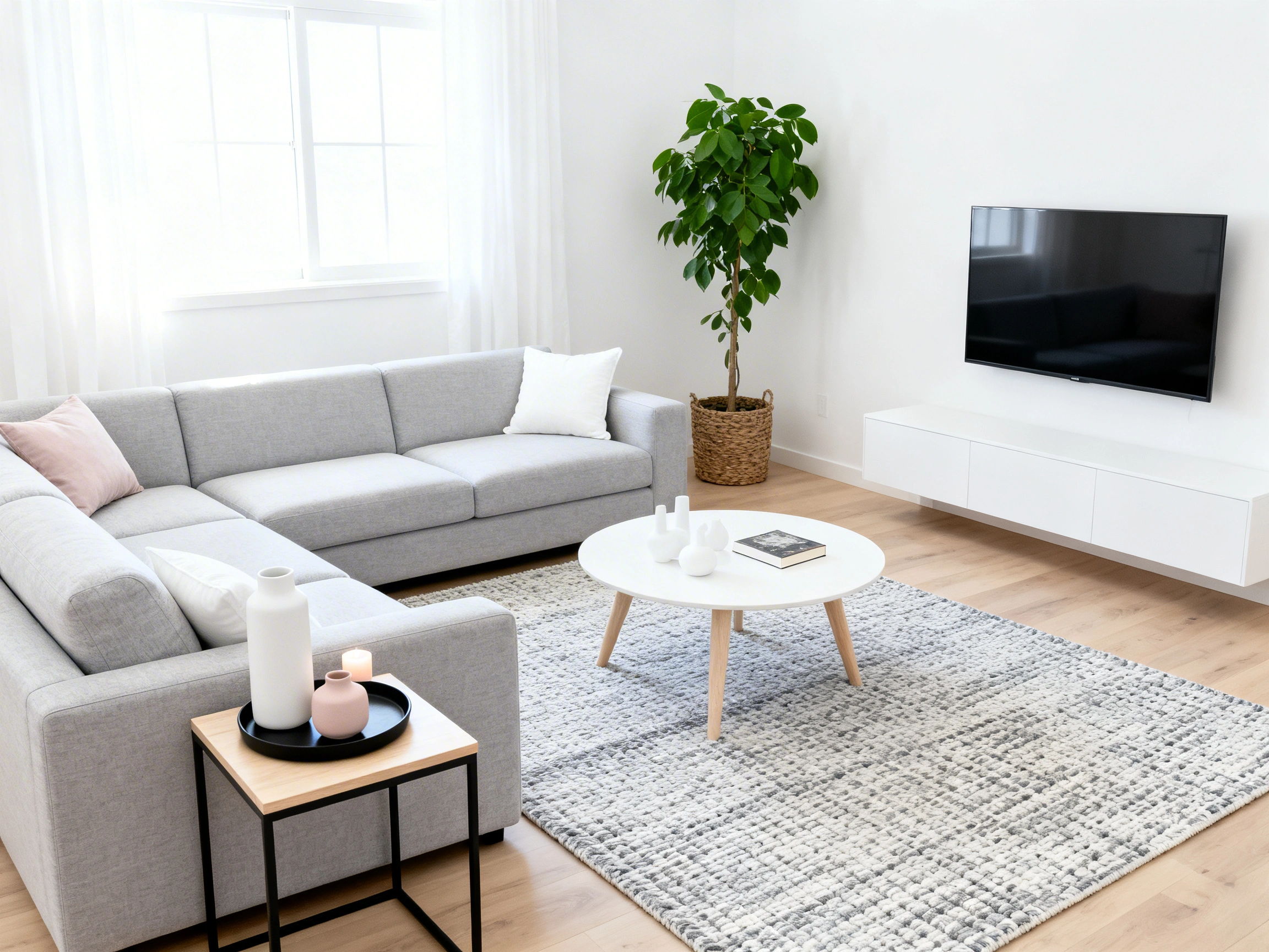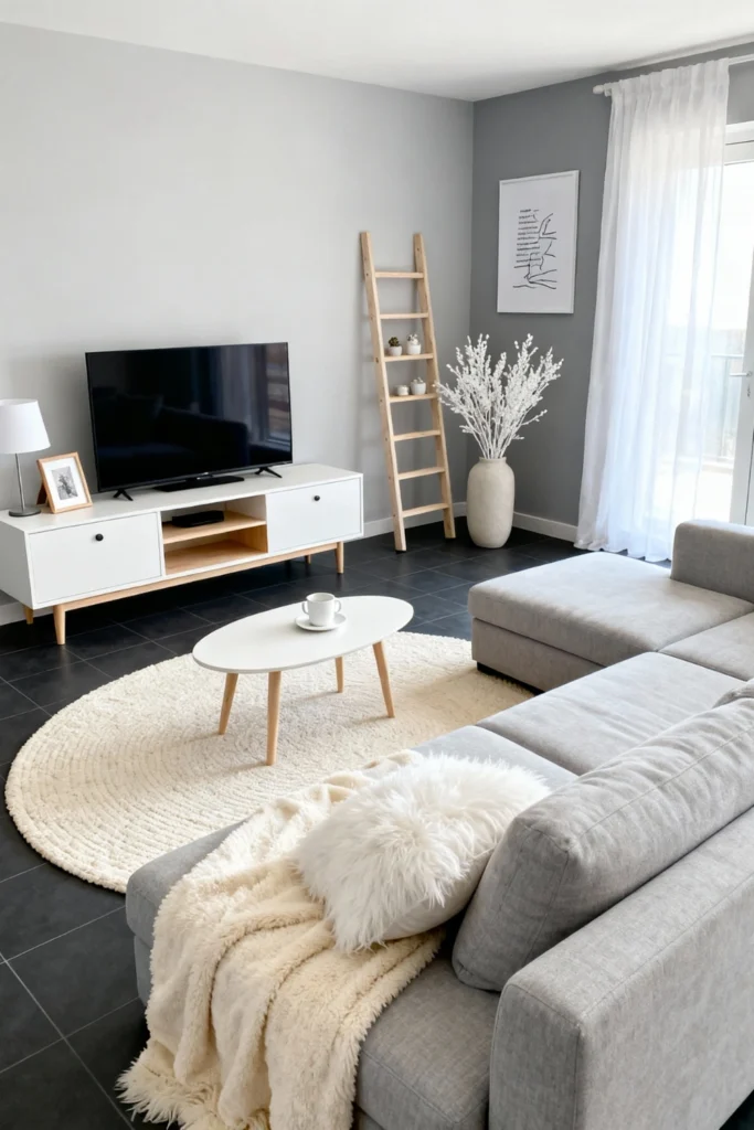 This look is all about “clean and serene.” Use a cool gray on the walls and ground the space with dark, slate-like flooring. A white mid-century media unit with light wood legs keeps things feeling breezy. Add a simple wooden ladder for a touch of height and an oval coffee table to break up the straight lines. A textured, round cream rug defines the “chill zone” without overwhelming the room. It’s the perfect setup for a modern apartment where every piece needs to count.