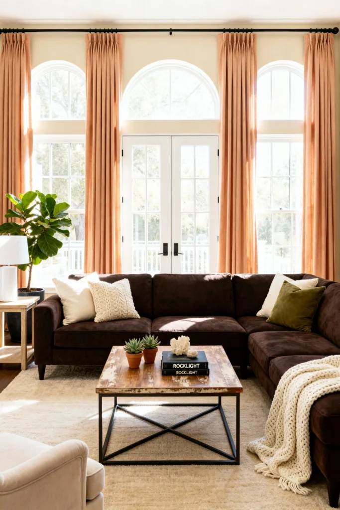 For a look that feels grounded but totally sophisticated, go for deep, chocolate tones. A velvet sectional in a dark espresso shade serves as the perfect anchor. Frame your windows with long, floor-to-ceiling drapes in a soft terracotta to draw the eye upward and soften the light. A reclaimed wood coffee table with matte black legs adds that “industrial meets organic” touch. It’s a space that feels expensive but remains completely approachable—perfect for hosting wine nights or long Sunday afternoon naps.