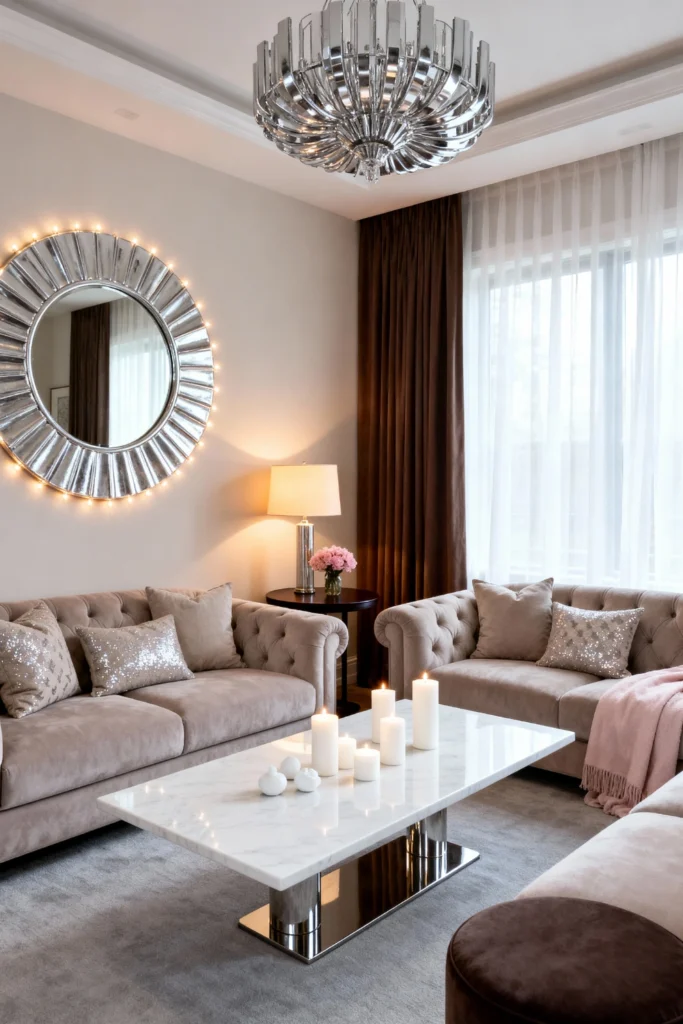 Ready for some high-wattage style? Think tufted velvet, silver finishes, and plenty of shine. A sunburst mirror with integrated lights makes a massive statement on a neutral wall. Pair your plush seating with a white marble coffee table and a chrome-finished chandelier. The mix of taupe velvet and sequined pillows creates a layered, luxurious feel that’s perfect for someone who loves a bit of sparkle. It’s sophisticated, moody, and undeniably high-end.