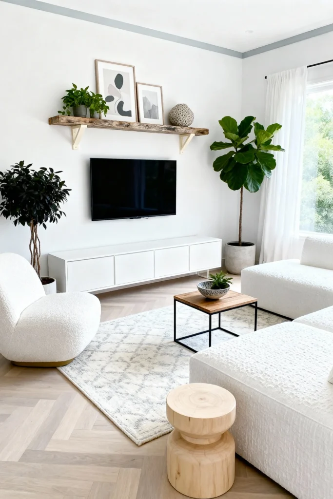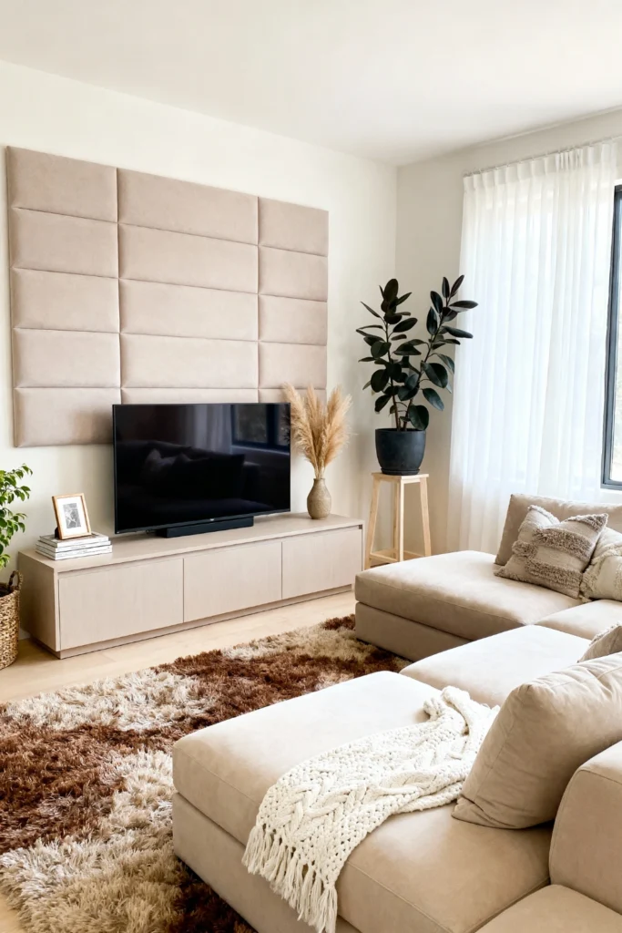 Love a monochrome look but don’t want it to feel cold? It’s all about the touch factor. Lean into beige and cream tones, but mix your materials. Use a large, padded wall panel behind your TV to add architectural interest without the clutter. Toss a chunky knit throw over a sleek sectional and find a high-pile, shaggy rug that your toes will love. A single tall plant in a black pot provides just enough contrast to keep the room from feeling flat.