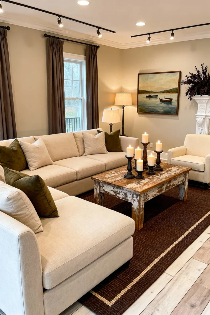 Imagine a modern farmhouse met a luxury hotel. Start with a massive, sandy-toned sectional and center it around a heavily distressed wood coffee table. For lighting, ditch the boring overheads for sleek black track lighting and a few classic floor lamps with linen shades. Olive green velvet pillows add a pop of forest-inspired color that feels timeless. To finish it off, a cluster of pillar candles on the table creates a flickering, moody focal point for evening conversations.