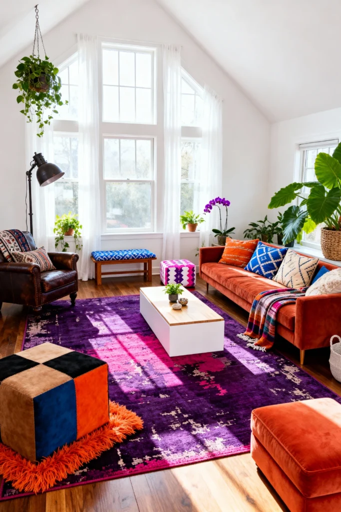 If you aren’t afraid of a little (or a lot) of personality, this one is for you. Think saturated purples and burnt oranges meeting high-vaulted ceilings. To nail this look, grab a plush rust-colored sofa and pair it with a bold, distressed rug that ties the whole rainbow together. Don’t forget the greenery! Tall, leafy plants like a Bird of Paradise bring life to those bright windows. It’s eclectic, it’s daring, and it feels exactly like a warm hug from a very stylish friend.