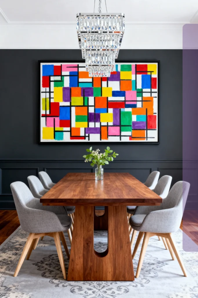Paint your walls a moody, dark charcoal to make your dining area feel incredibly chic. Center the room with a solid, warm walnut wood table featuring a unique cut-out base. Surround it with comfortable, light grey upholstered bucket chairs on wooden legs. Hang an ultra-modern, tiered rectangular glass chandelier to add a touch of sparkle. Make a massive statement by hanging an oversized, brightly colored geometric canvas right against the dark wainscoting to steal the show.