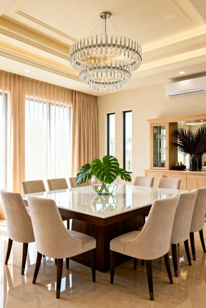 Select a large, square dining table with a sleek marble top and a solid wood base. Surround it with incredibly plush, beige upholstered chairs for maximum comfort during long dinners. Suspend a glamorous, multi-tiered glass fringe chandelier to bounce light around the room. Keep the table decor minimal with a simple glass bowl holding large, fresh Monstera leaves. Frame your large windows with soft, sheer beige curtains to let the natural sunlight pour in beautifully.