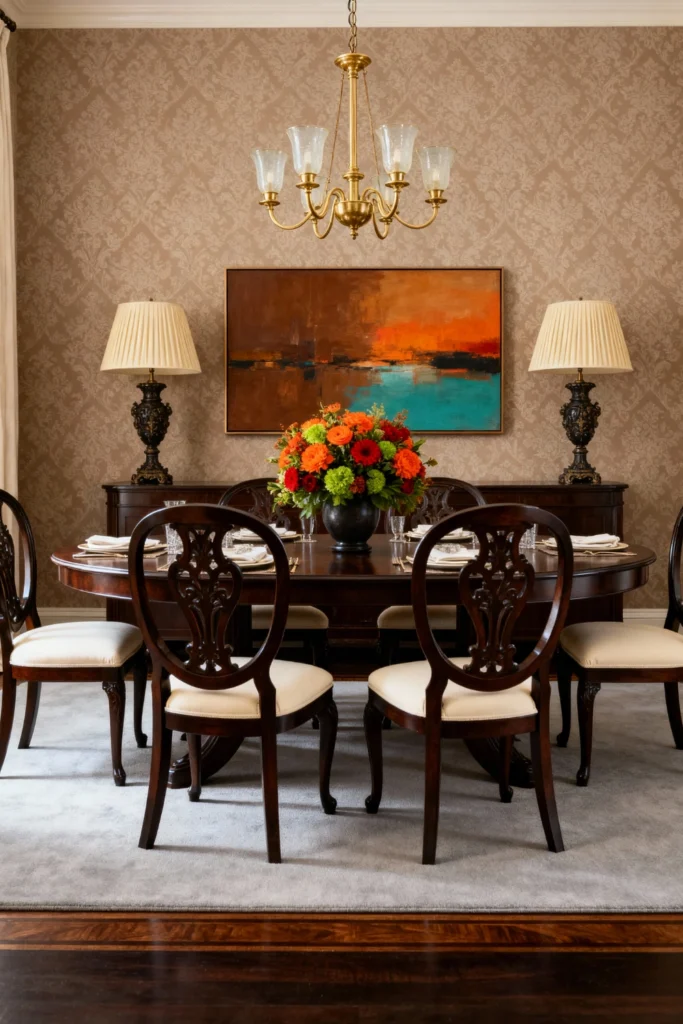 Opt for a beautifully polished, dark mahogany oval table to set a formal tone. Pair it with exquisitely carved dark wood chairs featuring cream upholstered seats. Dress the walls in a subtle, neutral damask wallpaper to add texture without overwhelming the space. Hang a traditional polished brass chandelier overhead. Place two ornate, dark sculpted lamps on a matching sideboard, and center an incredibly vibrant, warm-toned abstract painting to bring a surprising pop of modern color.