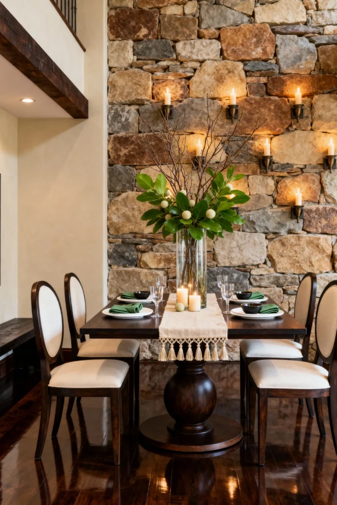 Anchor your room with a heavy, dark wood pedestal table. Surround it with classic, round-backed chairs upholstered in a crisp white fabric. Embrace a rustic feel by featuring a striking floor-to-ceiling stone wall, adorned with wrought-iron candle sconces for that perfect ambient glow. Lay down a textured macrame runner and top it with a dramatic, tall glass vase filled with fresh green branches. Set the table with deep green napkins to pop against the dark wood.