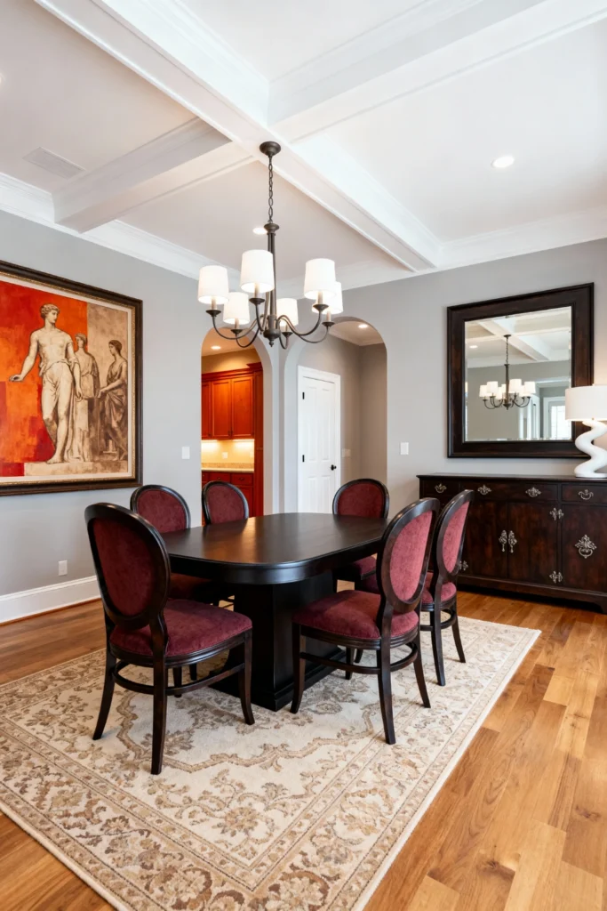 Choose a sophisticated, dark espresso dining table with a thick, solid base. Contrast it perfectly with elegant oval-back chairs upholstered in a rich, textured burgundy fabric. Hang a classic iron chandelier with white fabric shades for a soft, diffused light. Place a large, dark-framed mirror over a vintage-style wooden buffet to reflect the light and make the room feel larger. Finish the space by hanging a large, classical art piece featuring ancient figures.