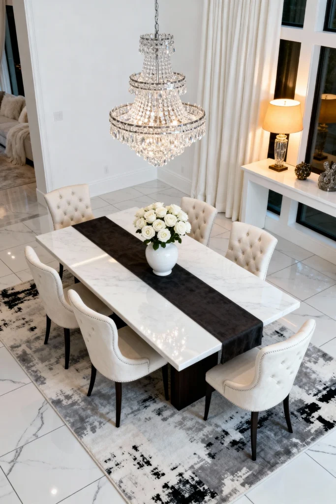 Choose a sleek white marble dining table to instantly elevate your space. Surround it with elegant, tufted high-back chairs in a soft cream velvet. Suspend a massive, sparkling tiered crystal chandelier right above the table for ultimate glamour. Run a dramatic black velvet runner down the center and top it with a simple, chic white vase full of fresh roses. Ground the whole luxurious setup with a subtle grey and black abstract rug over polished white tile.