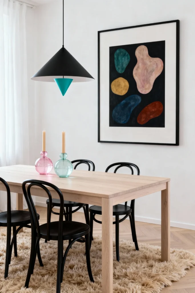 Keep things light and airy with a simple, blonde wood dining table. Contrast the pale wood with classic black bentwood chairs for a graphic punch. Hang a quirky, geometric black and teal pendant light to serve as a fun conversation starter. Anchor the seating area with a deeply textured, fluffy flokati rug. Complete the look by hanging a large, boldly colorful abstract art print on a crisp white wall to inject a dose of playful energy.