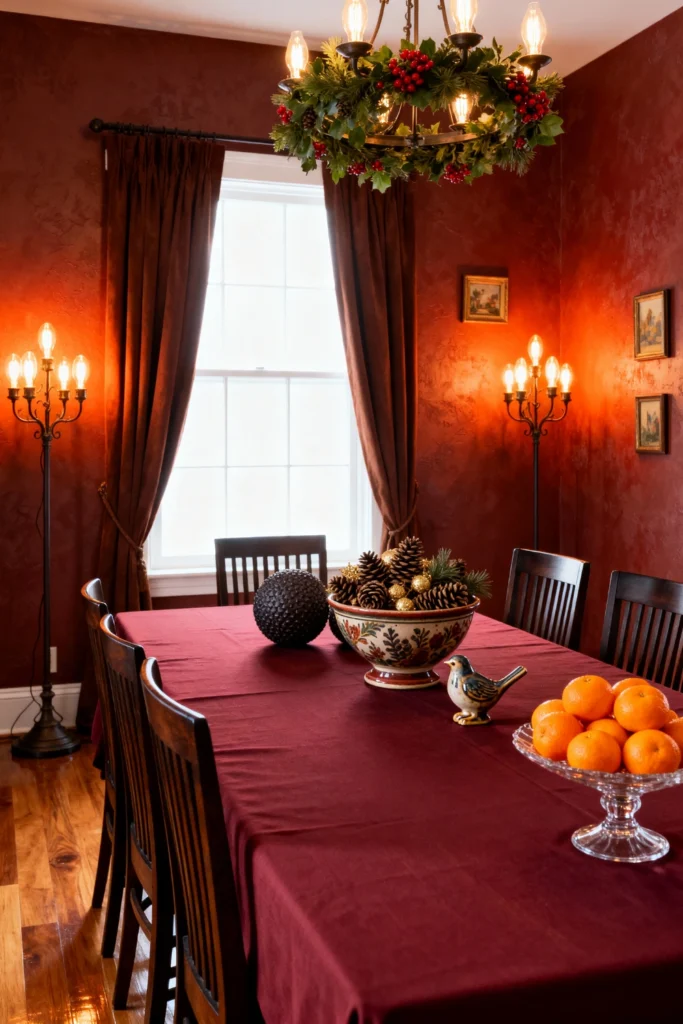 Paint your walls a deep, textured brick red to create an instantly intimate and warm atmosphere. Cover your dark wood dining table with a matching burgundy tablecloth. Opt for classic dark wood slat-back chairs. Hang a rustic iron chandelier draped with festive greenery and berries overhead. Place tall, vintage-style floor lamps in the corners to cast a cozy, amber glow. Finish the look with a big, welcoming bowl of fresh citrus or pinecones right in the center.