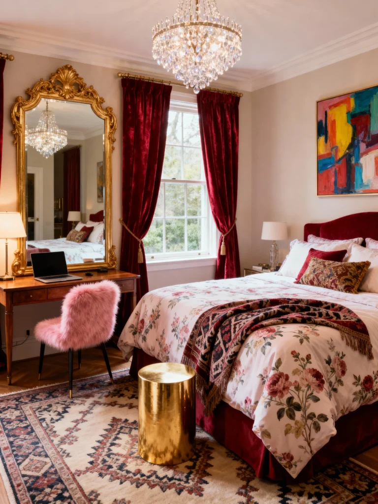 For those who love to go all out, maximalist design is the way to go. It’s all about embracing bold patterns, rich colors, and layers of textures. Maximalist design is perfect for students who want to create a cozy maximalist bedroom that’s inviting, vibrant, and full of life. Here’s how to infuse your dorm room with maximalist energy: