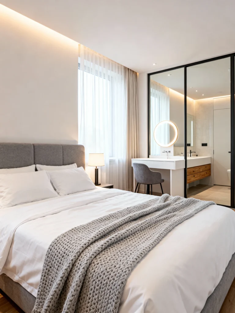- Layer Textures: Mix different textures in similar neutral tones: a plush rug, soft linen bedding, and a large, inviting upholstered headboard.