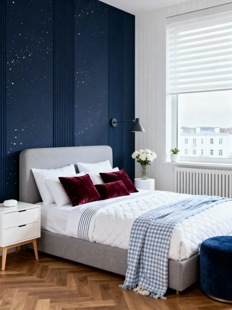 This look is all about bold contrast and a touch of magic! The deep navy feature wall with a subtle, starry texture creates a dramatic, moody backdrop that instantly draws you in. Pairing it with crisp white bedding and bright white paneling on the surrounding walls keeps the room from feeling too dark and emphasizes the natural light from the window. The rich, burgundy velvet pillows add a luxurious pop of color and texture, making the whole space feel sophisticated and cozy.