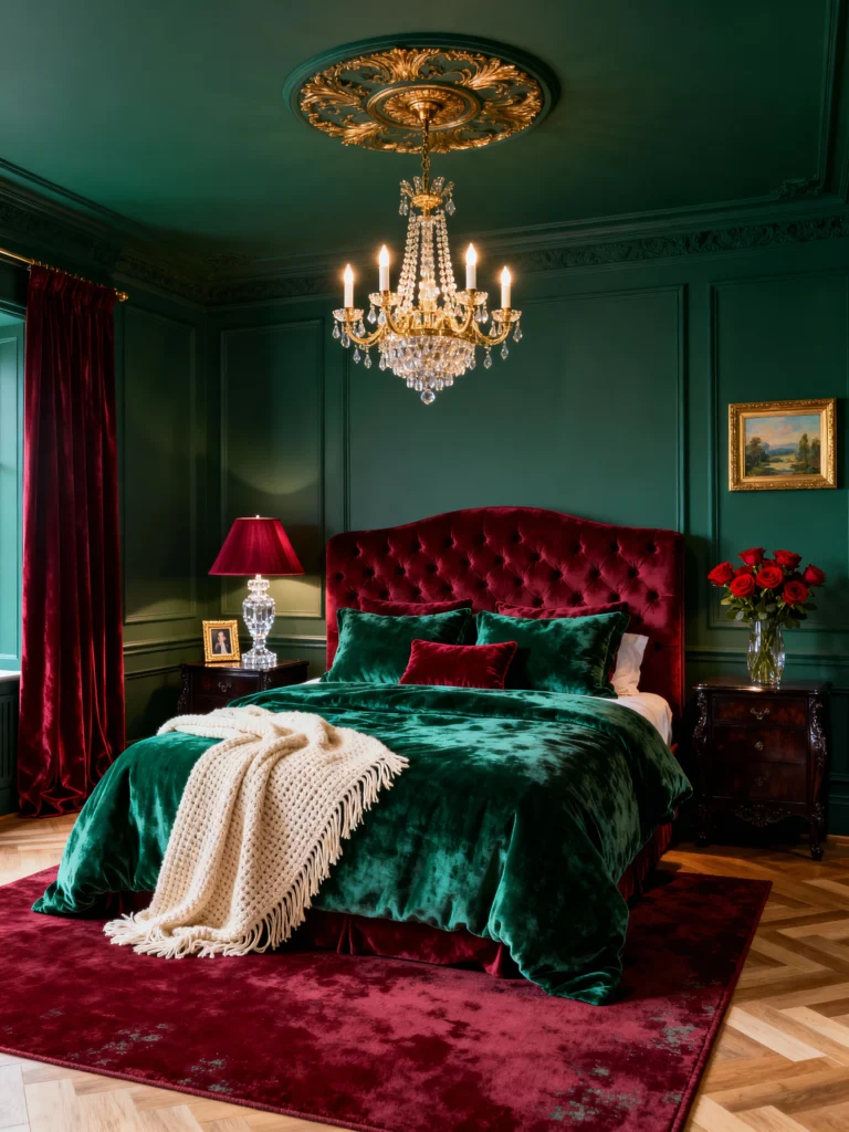 Welcome to the lap of luxury! This room screams opulent and dramatic with its rich, saturated color palette and velvety textures. The walls and trim are enveloped in a deep, glossy emerald green, creating a jewel-box effect. The vibrant ruby red bed and curtains stand out beautifully against the green, offering a gorgeous, high-contrast Christmas-y color scheme that feels lavish year-round, especially under that ornate gold chandelier.