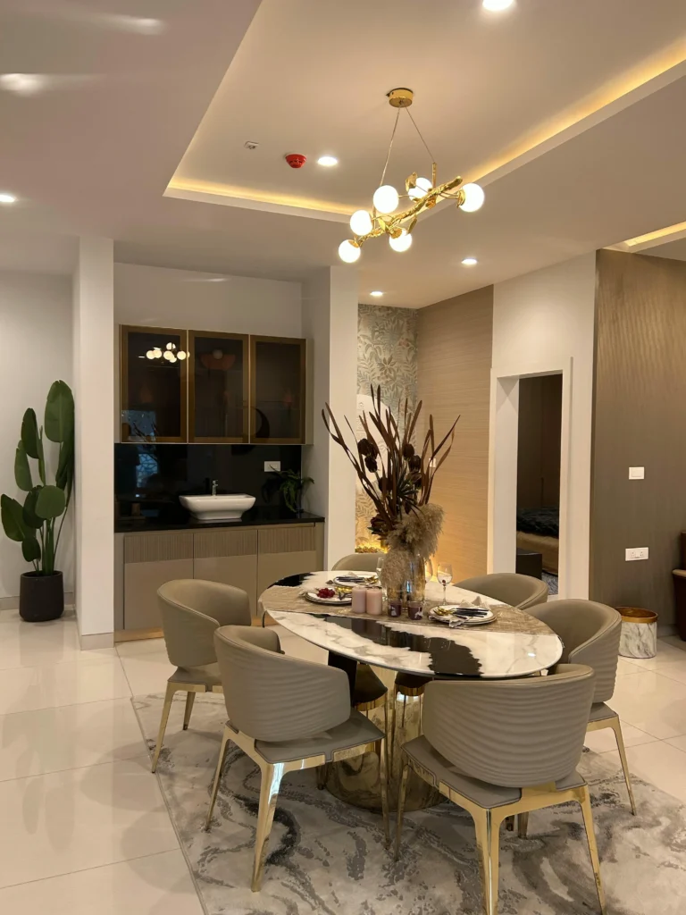 Embrace luxury with a modern twist. Center the room around an oval marble tabletop with a striking black and white veining pattern. Use taupe, curved velvet chairs with gold-tone metal legs to match the table’s golden base. Install a horizontal, multi-bulb gold chandelier to cast a warm glow. Behind the table, design a chic bar area with black counters and gold-framed glass cabinets. A large potted plant adds life to the corner.