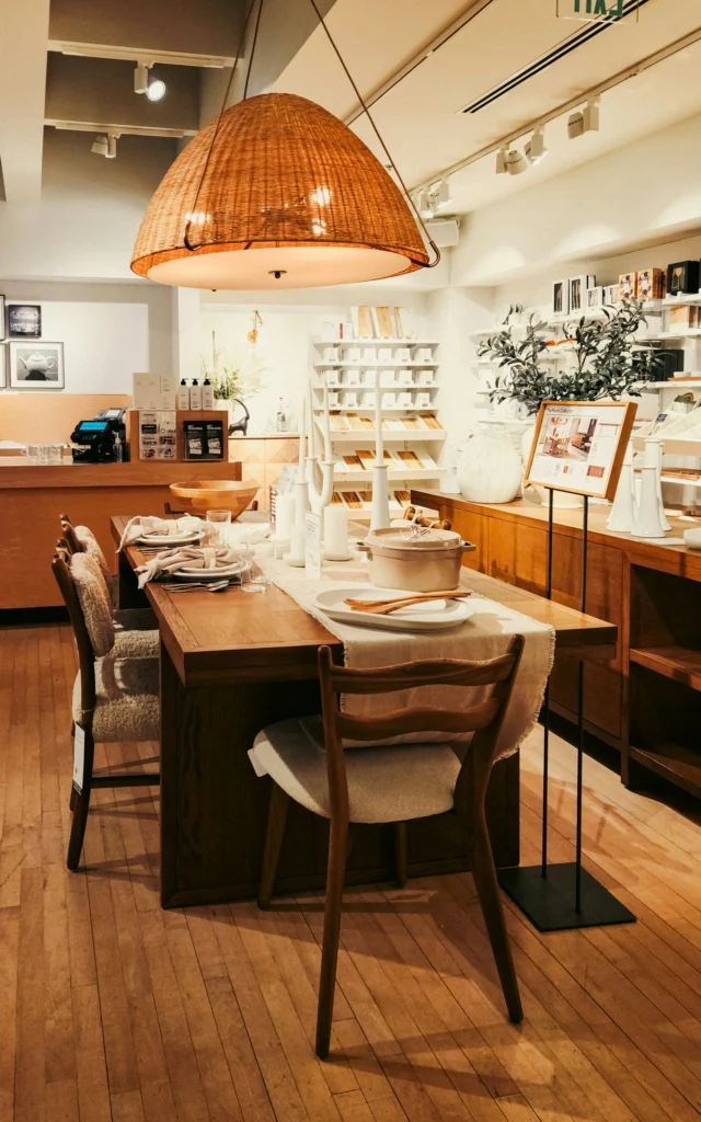 Bring in a natural, bohemian flair with a few key pieces. The absolute showstopper here is the oversized, woven rattan pendant light shade hanging low. Pair a solid, dark wood dining table with mixed dining chairs, perhaps combining wood and cozy upholstered boucle or shearling seats. Use a light, neutral table runner and simple white serveware. This style works great for open, retail-inspired spaces.