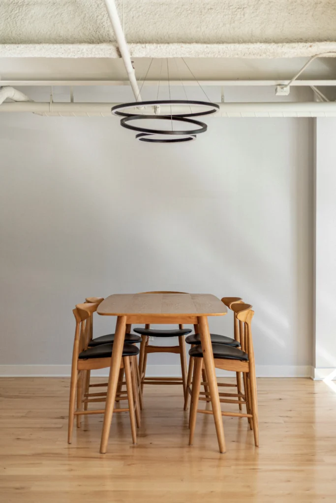 Play up a minimalist, industrial aesthetic. Keep the backdrop simple with light wood flooring and plain white walls. The main feature is the exposed ceiling with visible ductwork and piping. Select a simple, mid-century inspired wood table with gently curved edges. Use backless wooden barstools or chairs with black leather seats. The final touch is the contemporary chandelier made of sleek, black concentric rings.