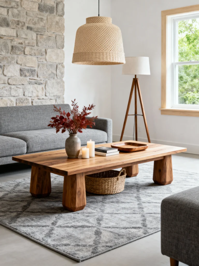 Bring the outdoors in by using natural materials like wood, stone, and jute. A wooden coffee table, stone accent wall, or woven baskets can add warmth and texture to your space.