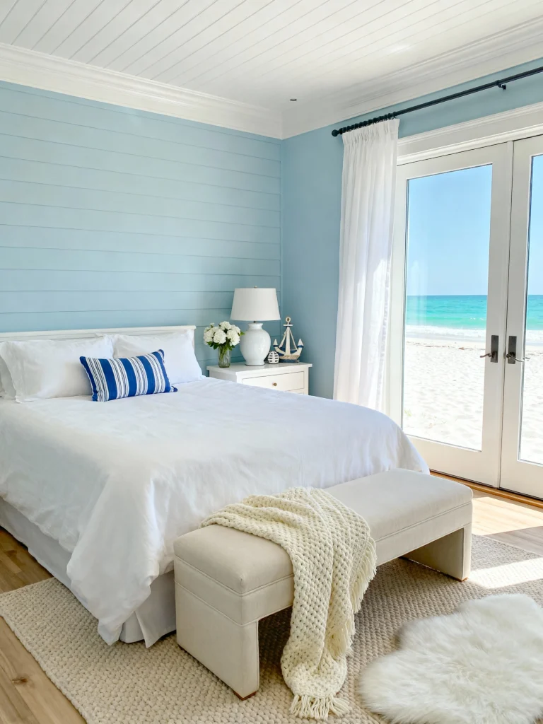 Imagine waking up in a room filled with light and soft colors. This coastal escape features a fresh vibe, thanks to its beachy blues and natural textures. With cozy touches and a breezy feel, it’s the ideal spot to unwind and recharge.