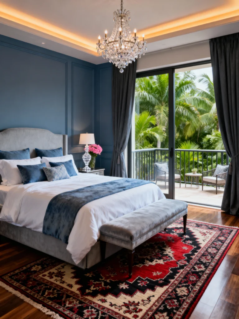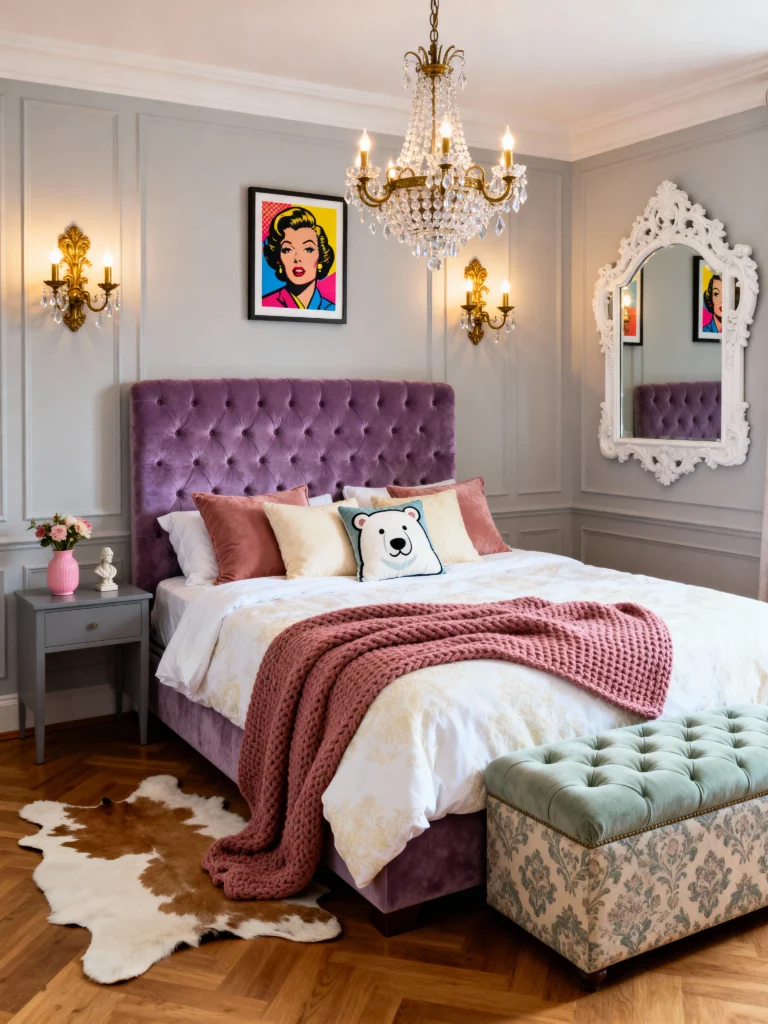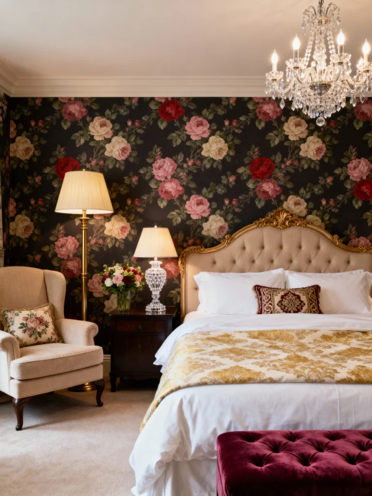 This bedroom exudes a charming vintage vibe with its floral wallpaper and soft color palette. The delicate chandelier and elegant furniture pieces create a cozy atmosphere that feels like a step back in time. It’s the kind of space that invites you to unwind and relax after a long day.