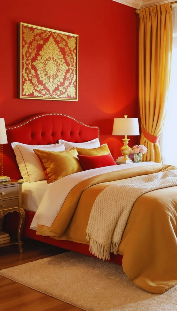 Talk about luxury! The deep red walls in this room set a passionate, rich tone, beautifully complemented by the lavish gold accents. From the ornate framed art to the silky gold bedding and curtains, this look screams old-world glamour. The tufted headboard adds a plush, sophisticated touch.