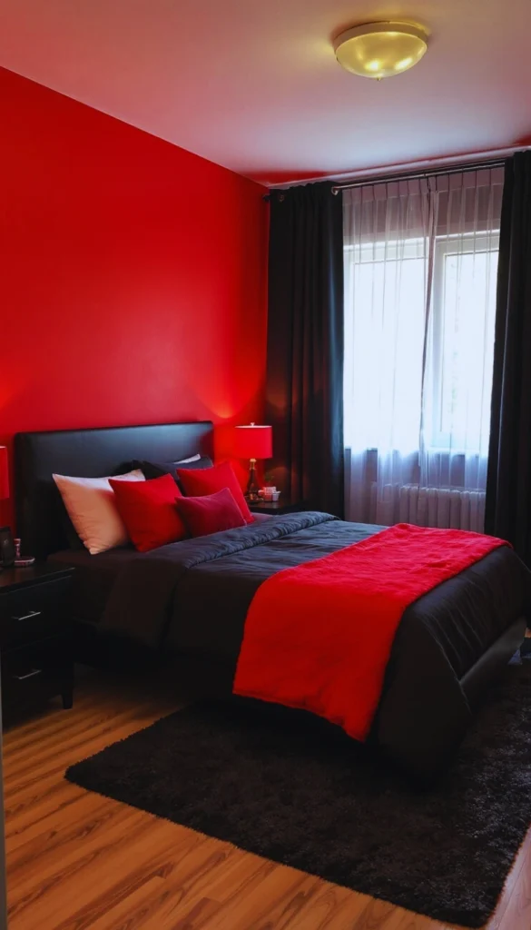This room is all about creating a romantic, luxurious vibe with a deep red accent wall. Pairing it with black bedding and dark curtains makes the red pop even more, giving the space a cozy, intimate feel. The bright white pillows keep the look from feeling too heavy.