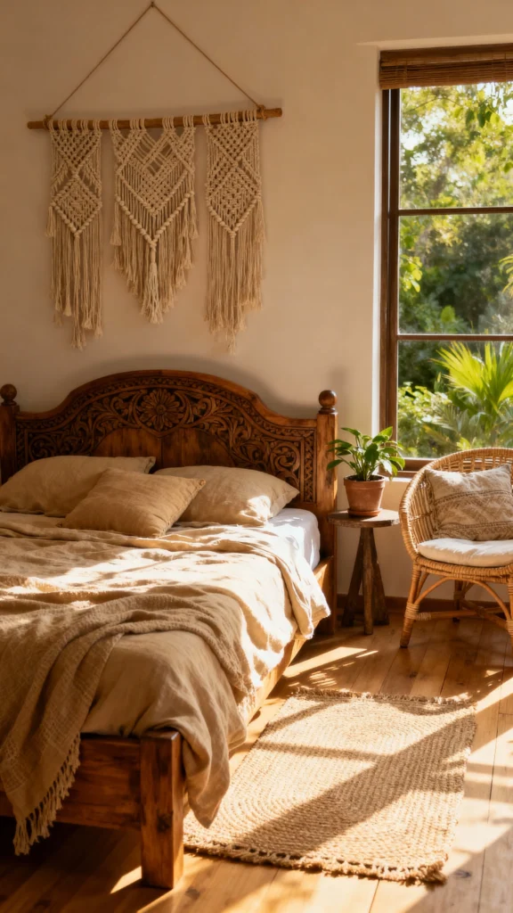 • Natural elements: Wood furniture, rattan chairs, and woven wall hangings.