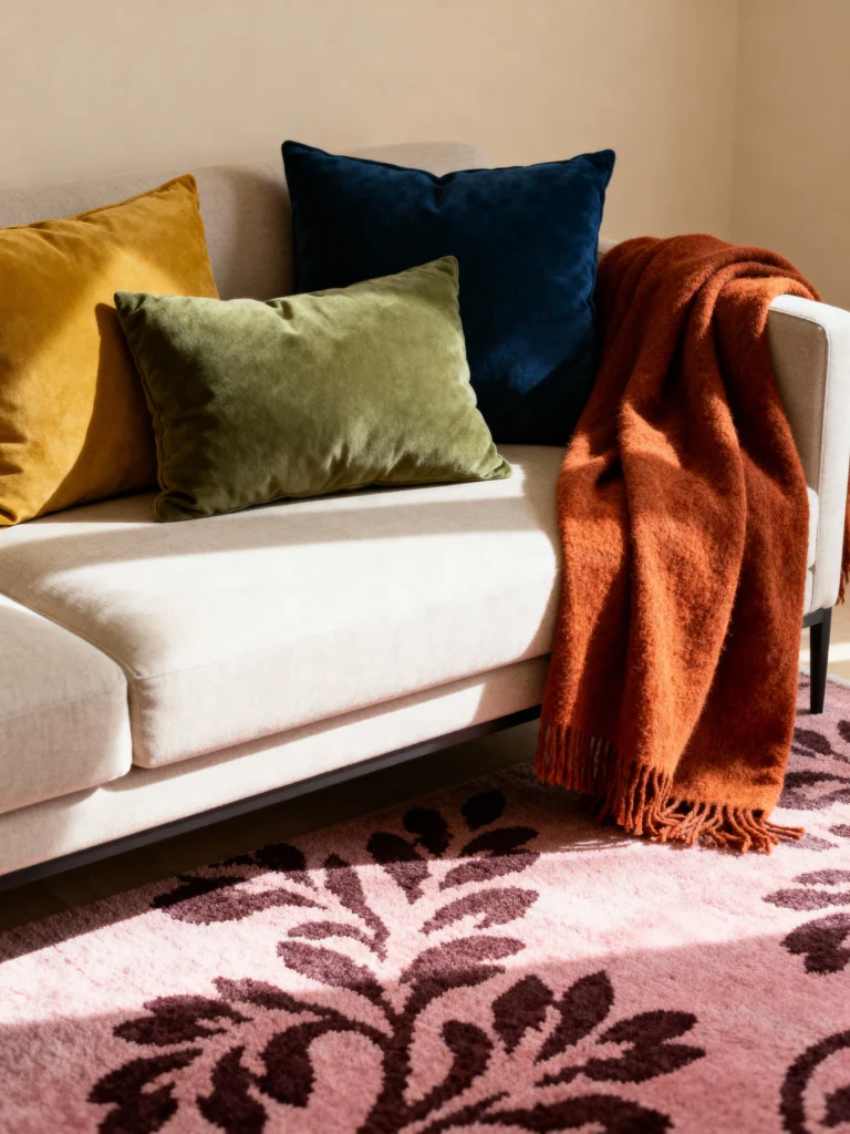 - Accent Colors: Add pops of color with accent pieces like throw pillows, blankets, and rugs. Earthy hues like mustard yellow, burnt orange, and olive green bring in warmth, while deep blues or dusty rose add sophistication without being overpowering.