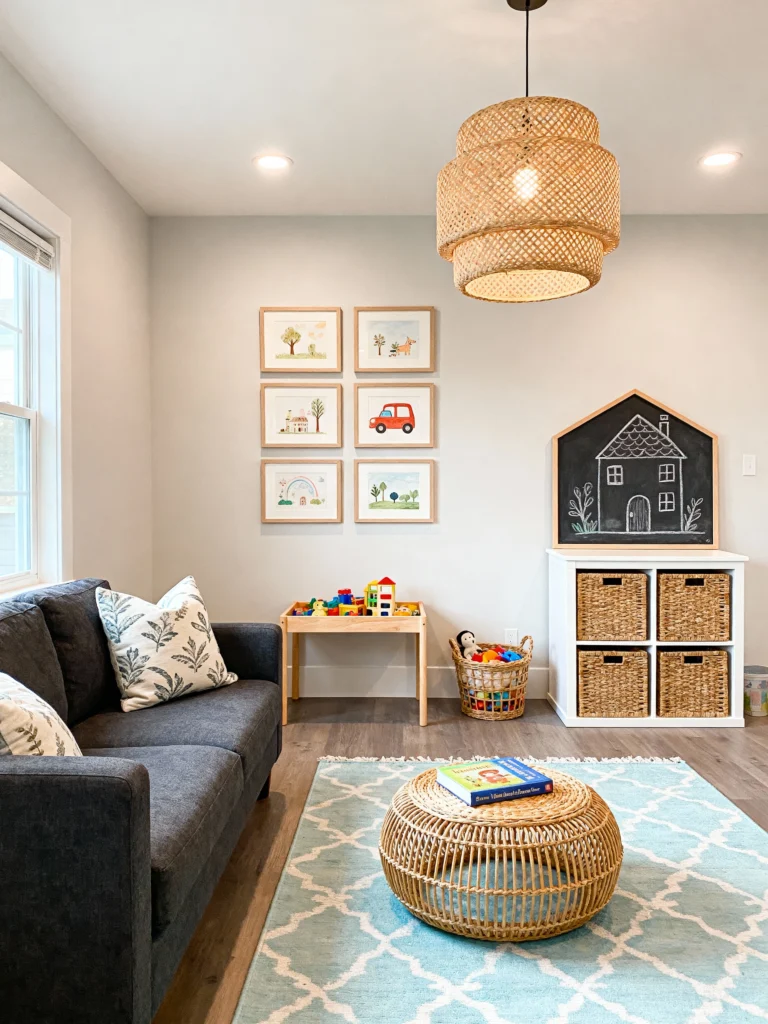 - Interactive Decor: Incorporate interactive decor pieces like a chalkboard wall for drawing, a puzzle table for games, or a toy basket to keep the space clutter-free yet playful. These elements are functional, engaging, and easy to store when not in use.