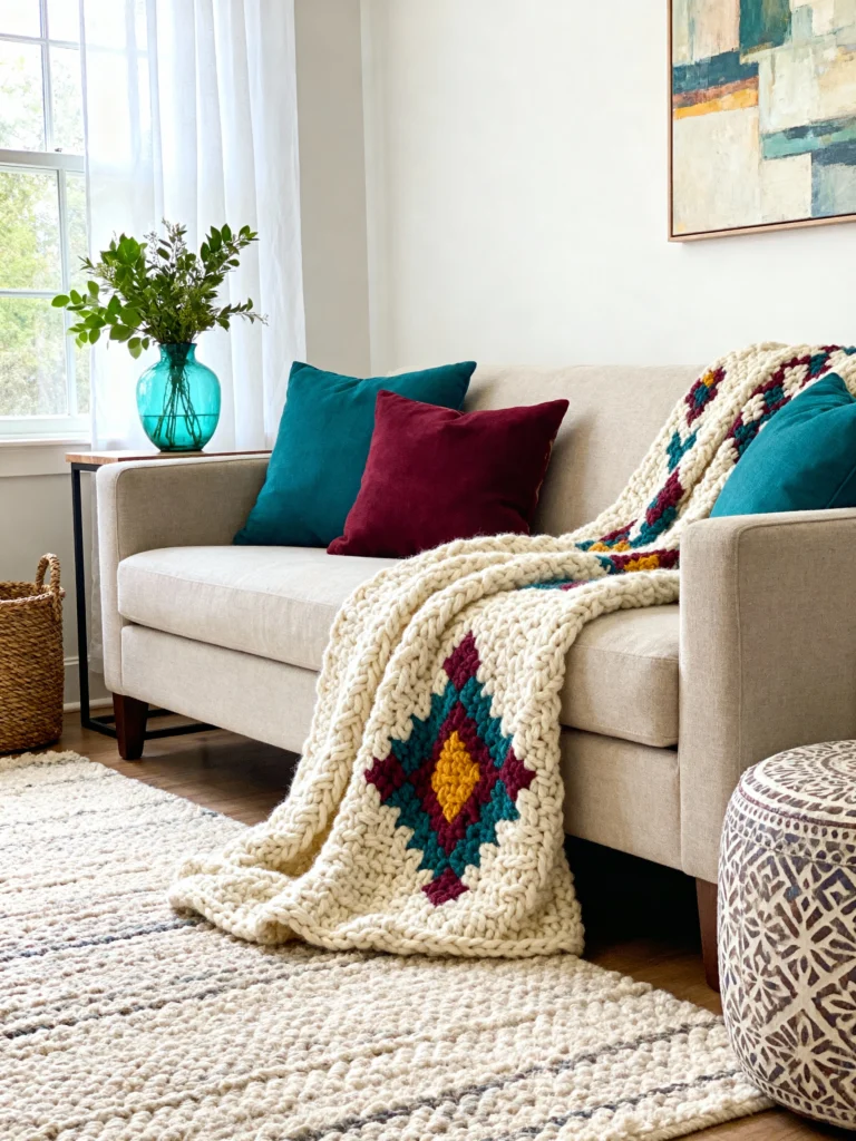 - Throw Blankets: A textured throw blanket in a chunky knit, faux fur, or cotton weave can instantly add warmth and comfort to your sofa. Use blankets in playful patterns or vibrant colors for an added pop.