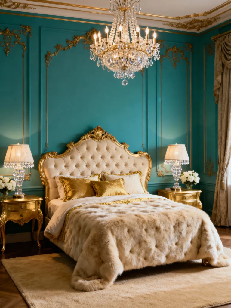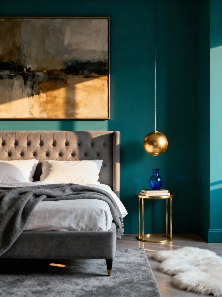 This blue-green beauty blends serenity with sophistication. It’s perfect for modern bedrooms of any size. Pair it with sleek furniture and metallic accents—think silver or copper. Clean lines and minimal vibes make this a 2025 must.