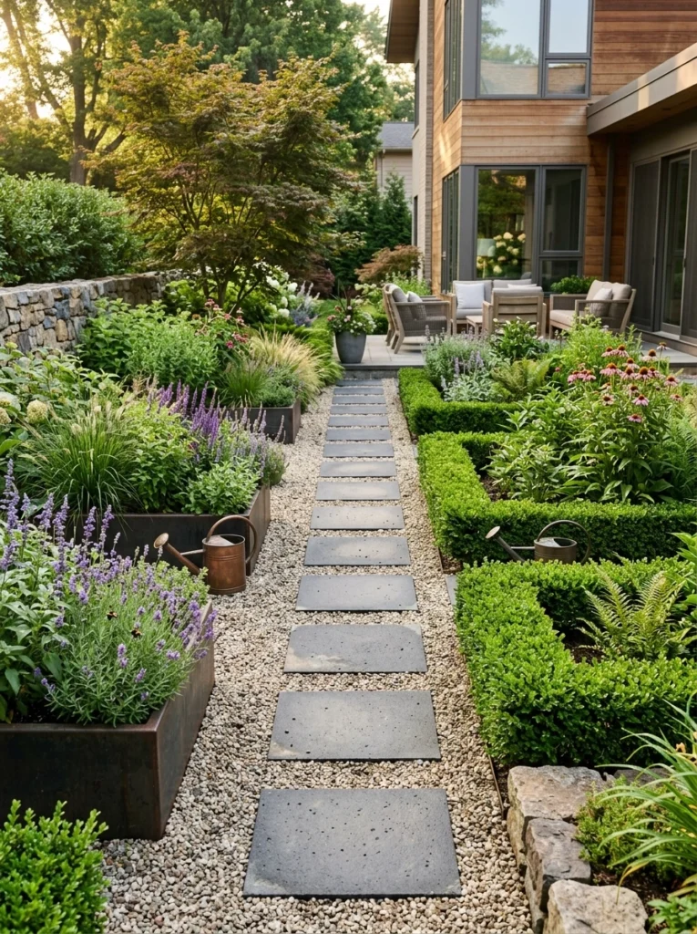 - Practical Explanation: Grid-like precision. This uses rectangular raised planters, perfectly square stepping stones, and tightly clipped boxwood hedges.
