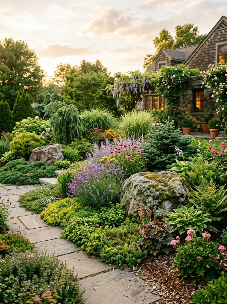 - Practical Explanation: A curated blend of evergreens, sprawling ground covers, and large accent boulders to create a natural yet highly designed slope or yard.