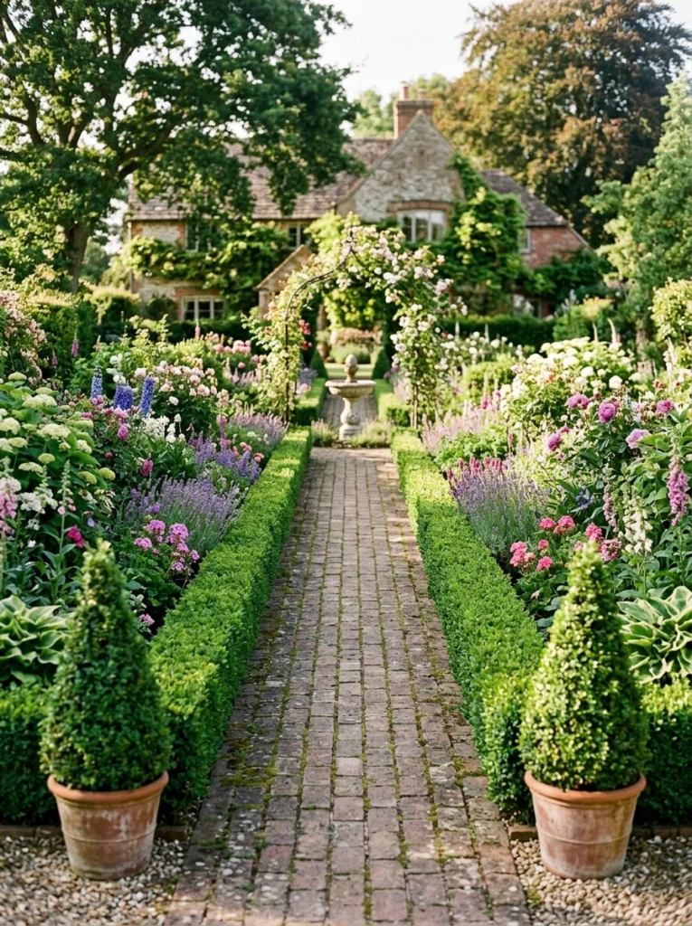 - Practical Explanation: Pure order and elegance. A central brick or flagstone walkway flanked perfectly by matching topiary accents and mirrored planting beds.