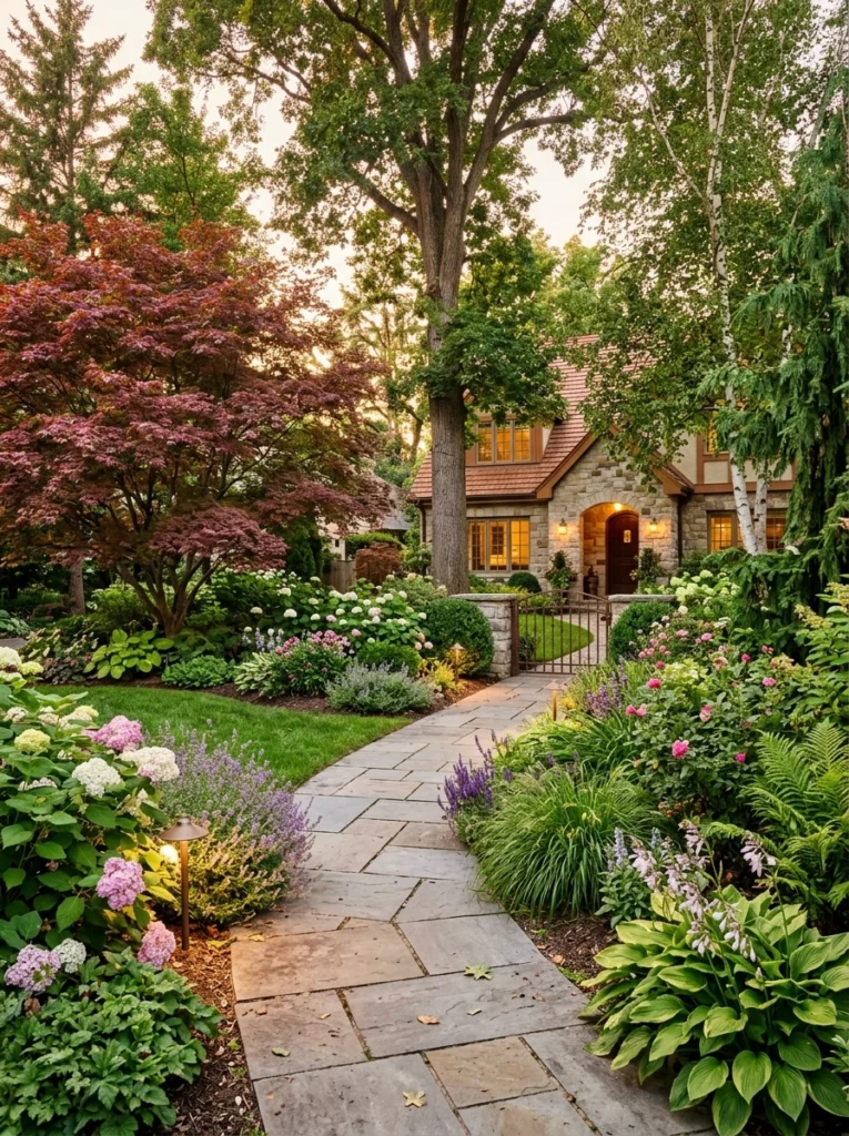 - Practical Explanation: This layout uses sweeping, curved beds flanking your main walkway, anchored by statement trees like Japanese Maples or dogwoods.