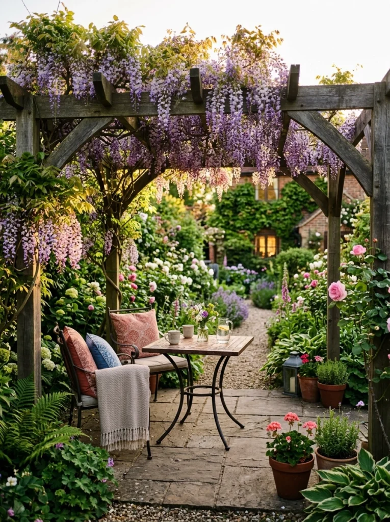 - Practical Explanation: A structural masterpiece that blurs indoor and outdoor living. Think of a sturdy wood or metal pergola draped in wisteria over a stone patio.