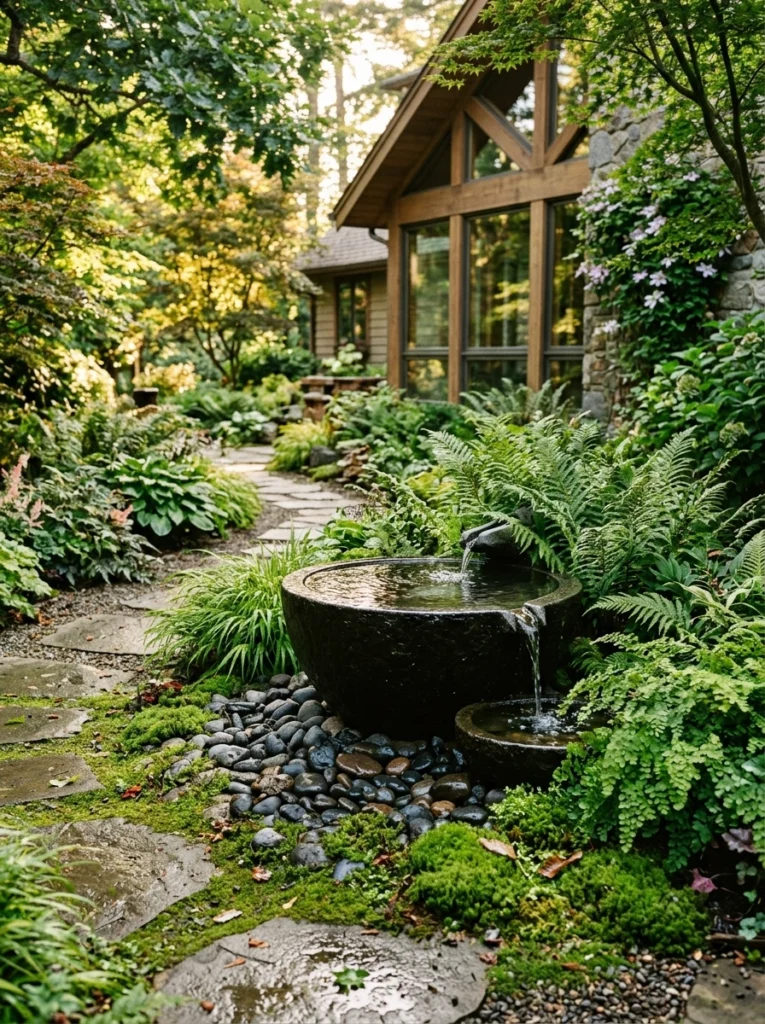 - Practical Explanation: Gardens aren’t just visual; they are auditory. This features a striking modern water bowl or fountain surrounded by lush ferns and mossy ground cover layers.