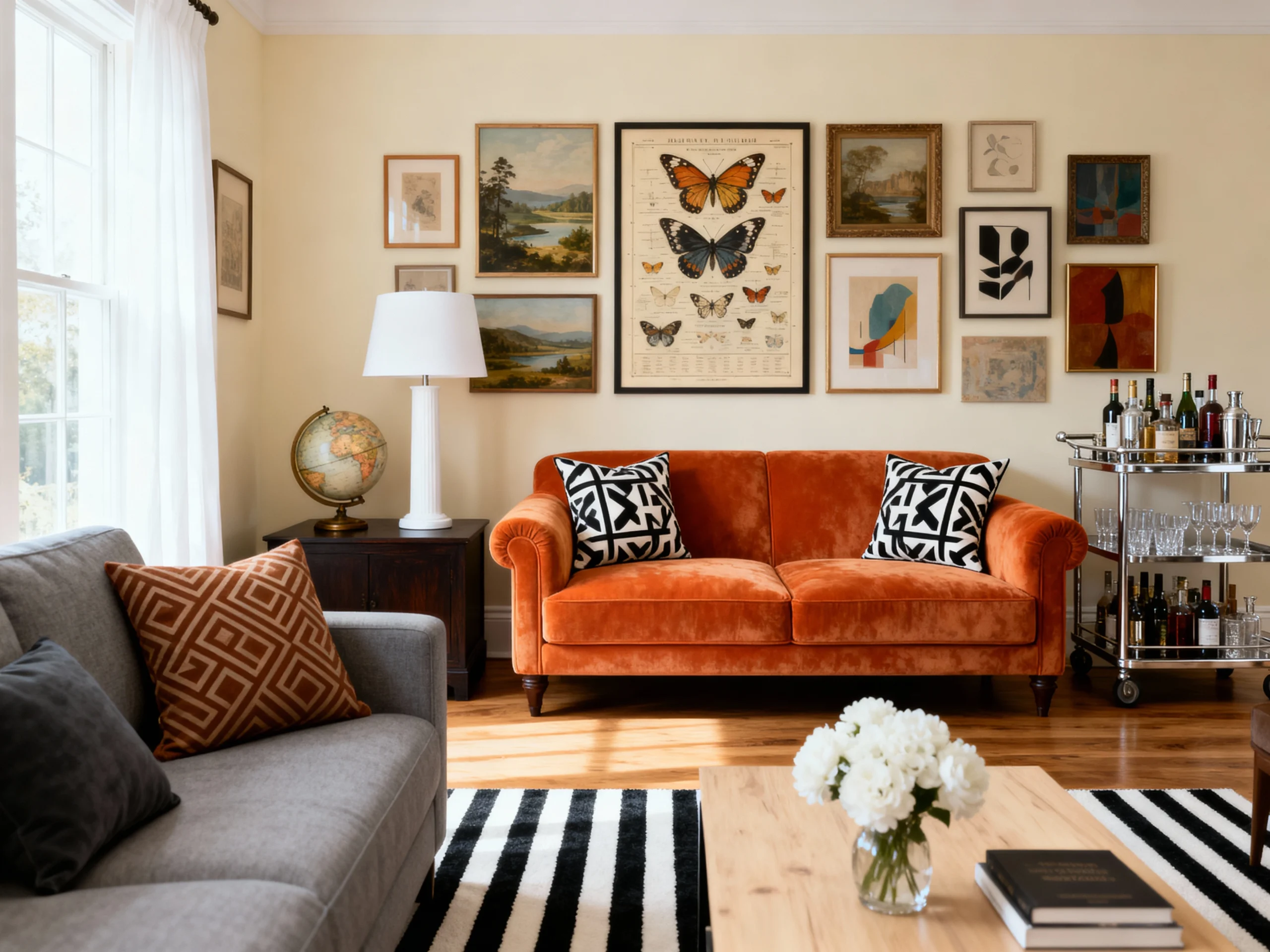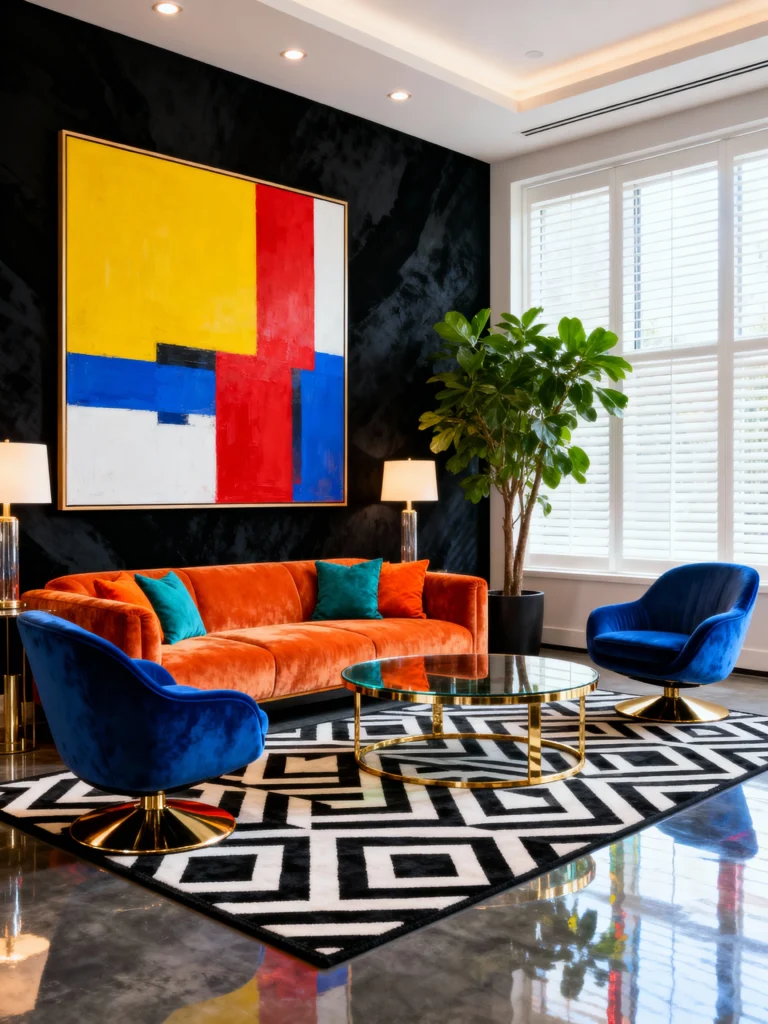 Go big with a burnt orange velvet sofa set against a dramatic, black feature wall. Anchor the room with a bold, black-and-white geometric rug to create high contrast. Add jewel-toned blue velvet swivel chairs to create a vibrant, artistic conversation circle. Hang an oversized abstract painting to tie the primary colors together perfectly. Finish with gold-accented glass coffee tables to add a splash of modern luxury to the mix.