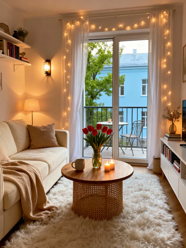 Create a sanctuary with a compact beige sofa and layers of chunky knit throws. String warm fairy lights around sheer white curtains to softly frame your balcony view. Place a round wooden coffee table in the center, topped with fresh red tulips and flickering pillar candles. Add a textured shag rug underfoot to maximize that “hygge” feeling on chilly evenings. Keep the lighting low and inviting.